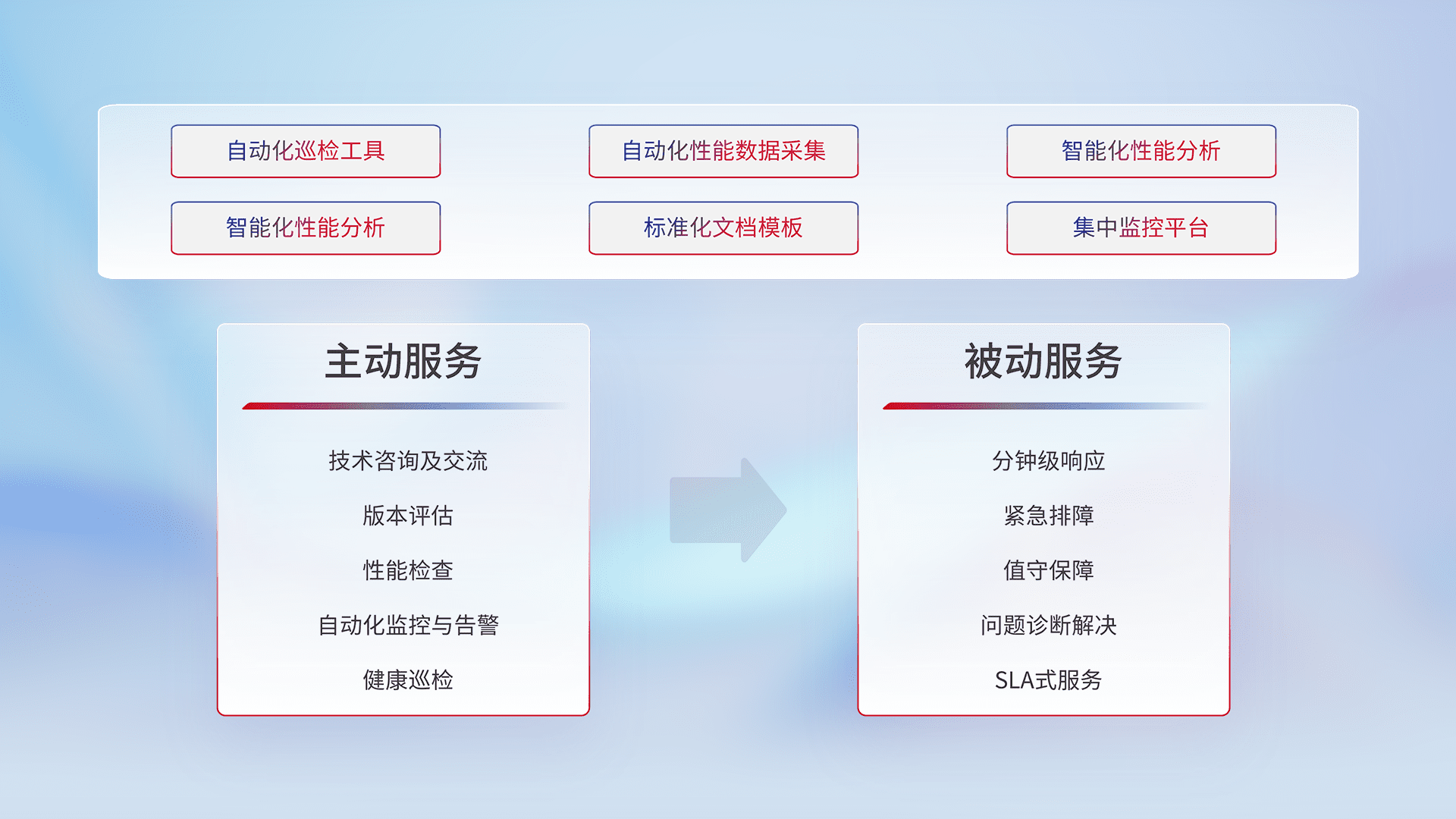 智能化工具和标准化文档,,保障服务质量,,,,提供主动服务(包含技术咨询、、、版本评估、、、性能检查、、、自动化监控与告警、、、、健康巡检)和被动服务包含(分钟级响应、、、紧急排障、、、值守保障、、问题诊断解决、、SLA服务)。。。